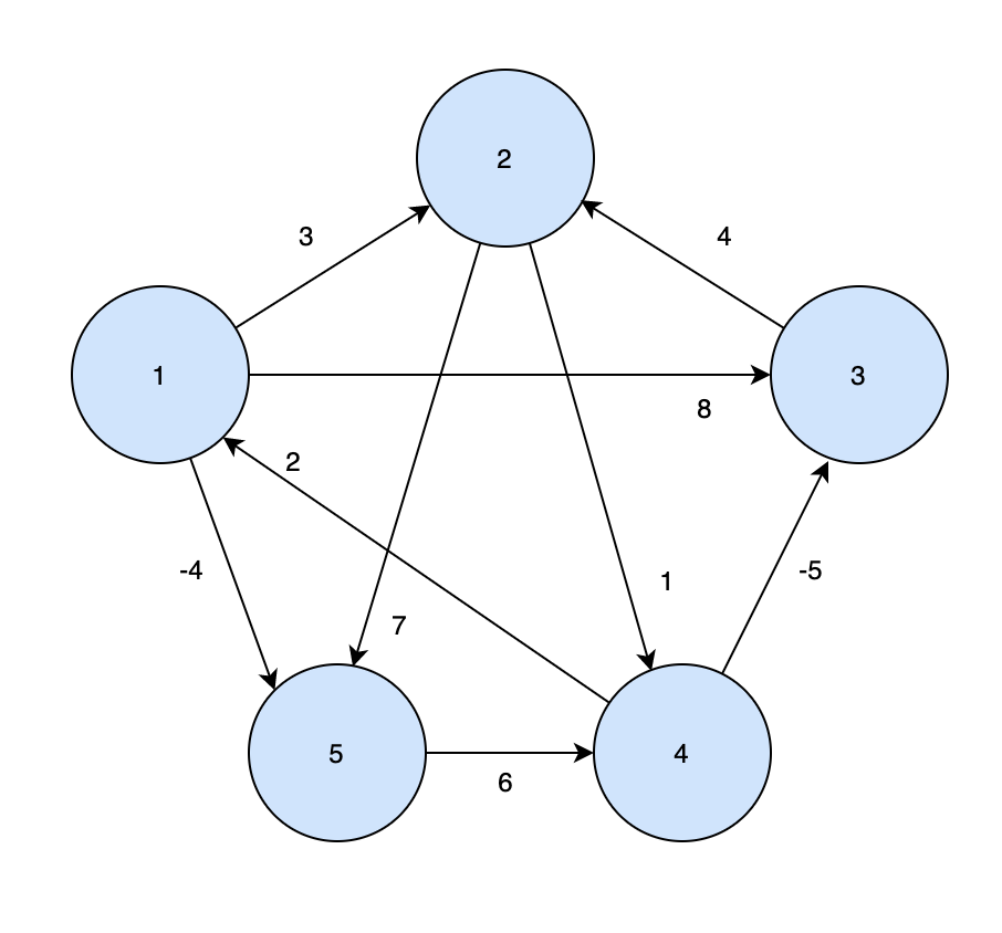 d[1][4] + d[4][3] = 4 + -5 = -1์ด ๊ธฐ์กด ์ต๋จ ๊ฑฐ๋ฆฌ์ธ 8๋ณด๋ค ์งง๊ธฐ ๋๋ฌธ์ ์ต๋จ๊ฑฐ๋ฆฌ๋ -1๋ก ๊ฐฑ์ ๋๋ค. - d[2][1] ์