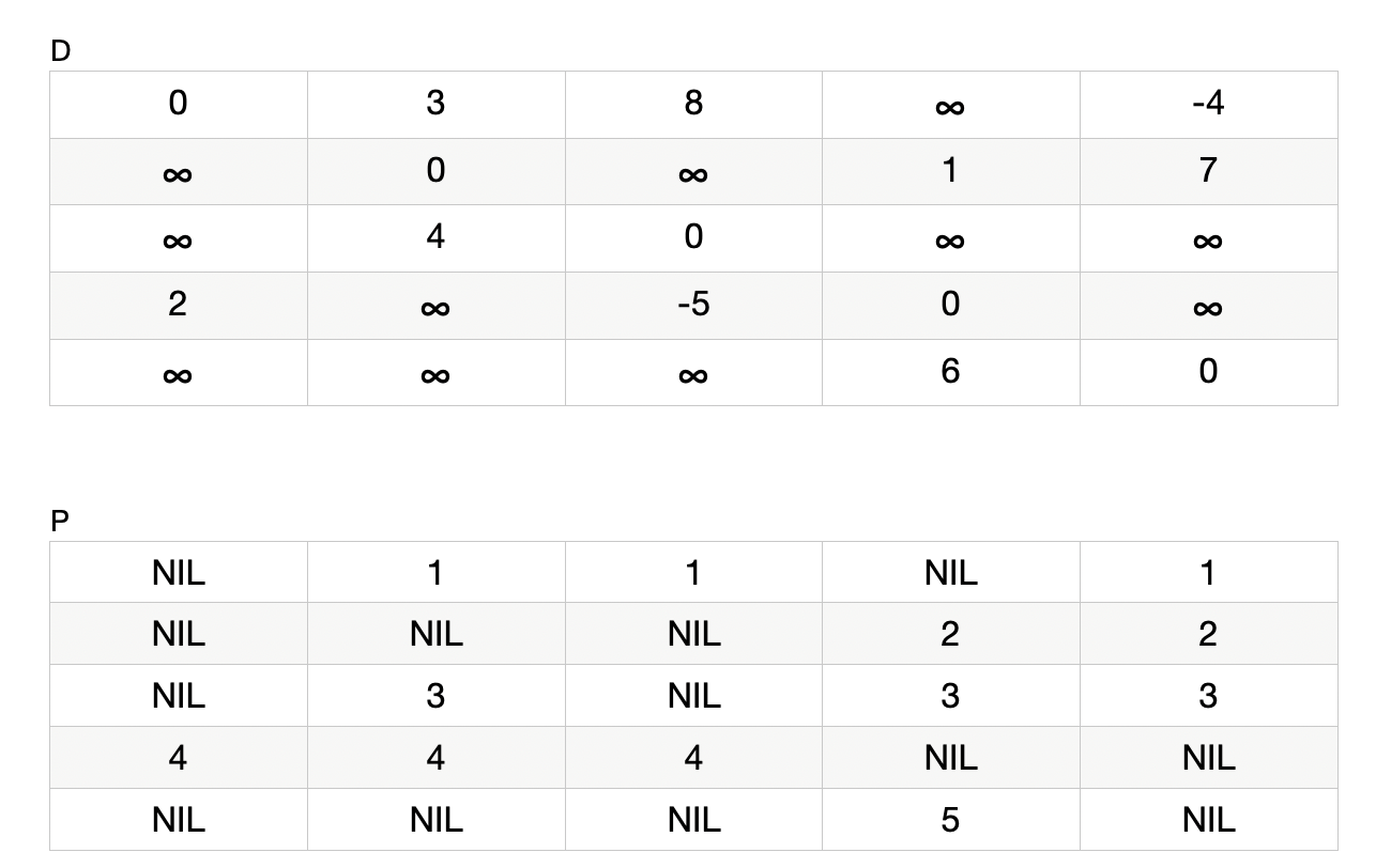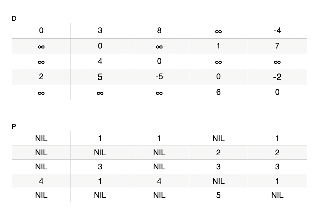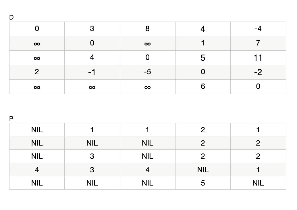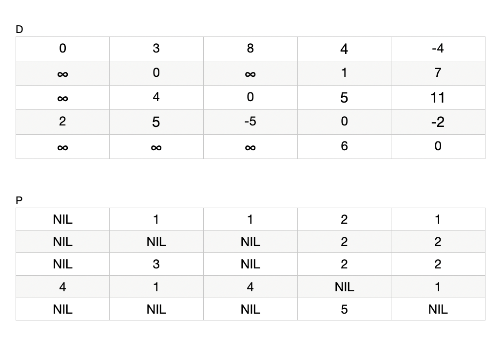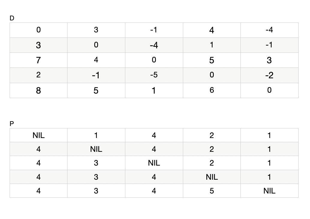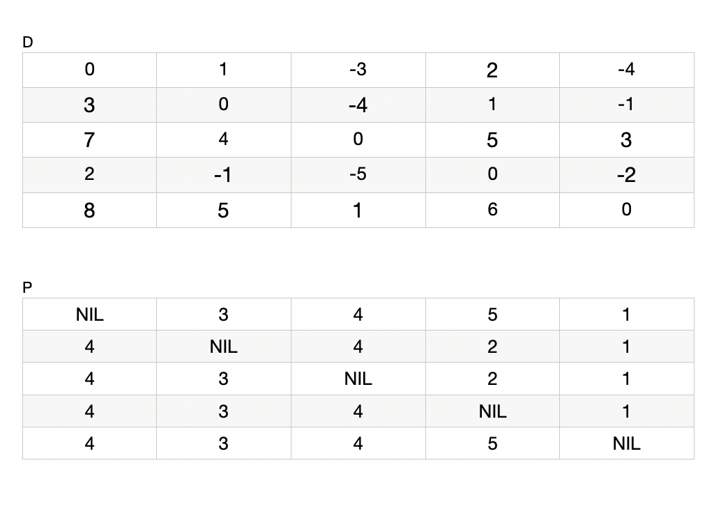 ๋จผ์ ๊ทธ๋ํ๋ฅผ ๊ธฐ๋ฐ์ผ๋ก ๋ ๊ฐ์ 2์ฐจ์ ๋ฐฐ์ด์ ์ด๊ธฐํ ํ๋ค. ๊ฐ ๋ฐฐ์ด ์์ [i][j]๋ i๋ถํฐ j๊น์ง์ ๊ฐ์ ์ ๋ณด๋ฅผ ์๋ฏธํ๋ค. ๋ฐฐ์ด D๋ ํ์ฌ๊น์ง ๊ณ์ฐ๋ ์ต๋จ ๊ฑฐ๋ฆฌ๋ฅผ ์ ์ฅํ๊ณ , P๋ ํด๋น ์ต๋จ๊ฑฐ๋ฆฌ๋ฅผ ๋ง๋๋ ๋ฐ๋ก ์ด์ ์ ์ ์ ์ ์ฅํ๊ฒ ๋๋ค.