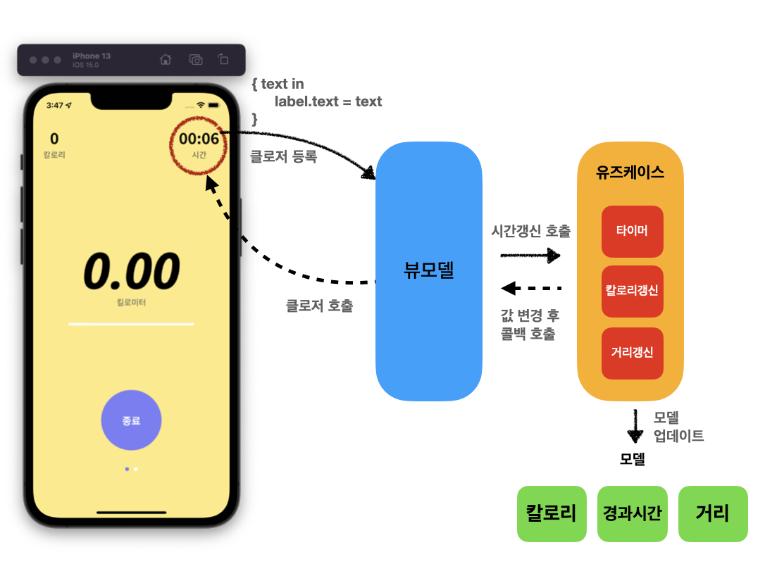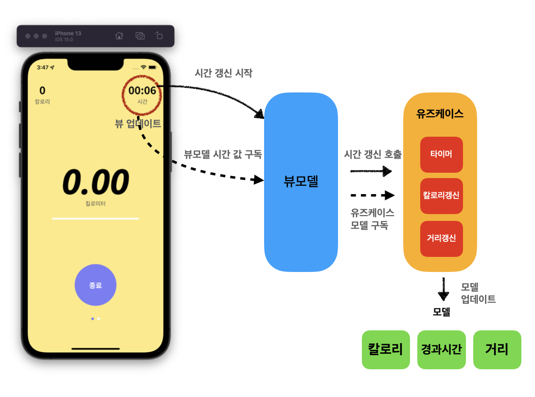 ์ ์์์ฒ๋ผ ๊ฑฐ๋ฆฌ ๊ฐ์ ๊ฐฑ์ ์ ์์ฒญํ๋ฉด ์ ์ฆ ์ผ์ด์ค๊ฐ ๊ฑฐ๋ฆฌ๋ฅผ ๊ฐฑ์ ํ๊ณ , ์ด ๊ฐ์ ๊ตฌ๋ ํ๊ณ ์๋ ๋ทฐ ๋ชจ๋ธ์ด ์๊ฐ ํฌ๋งท์ ๋ณ๊ฒฝํฉ๋๋ค. hh:mm:ss ํํ๋ก์. ๊ทธ๋ฆฌ๊ณ ์ด ๊ฐ์ด ์๋ก์ด ๋ฌธ์์ด๋ก ๋ทฐ ๋ชจ๋ธ์ ์ ์ฅ๋๋ฉด, ์ด๋ฅผ ๊ตฌ๋ ํ๊ณ ์๋ ๋ทฐ ์ปจํธ๋กค๋ฌ๊ฐ ์์ ์ ๋ ์ด๋ธ์ ์ ๋ฐ์ดํธํฉ๋๋ค.