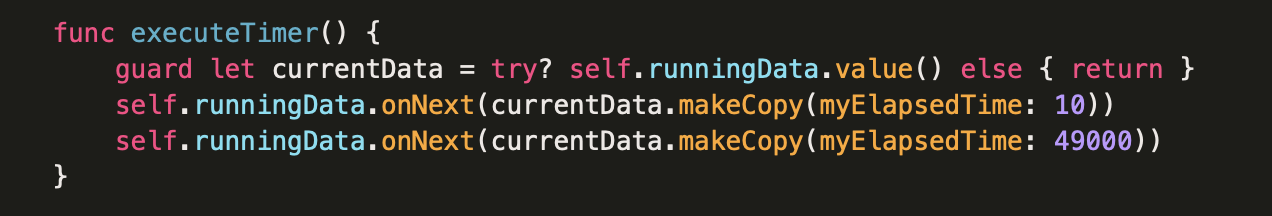 ๊ทธ๋ฆฌ๊ณ ์ค์ผ์ค๋ฌ๋ฅผ ํตํด ๋ทฐ ๋ชจ๋ธ์์ ๋ฐฉ์ถ๋๋ ๊ฐ๋ค์ ๋ฐ์ Observer๋ฅผ ํ๋ ์์ฑํฉ๋๋ค. ์ฌ๊ธฐ์๋ ์ ์๋ก ๋ ์ด๋จ์ ์๊ฐ์ด mm:ss ํํ๋ก ํฌ๋งทํ ์ด ์ ๋๋์ง ํ์ธํ๋ ํ ์คํธ์ด๊ธฐ ๋๋ฌธ์ ์ต์ ๋ฒ๊ฐ ๋ฐ์ ๋ฐ์ดํฐ์ ํ์ ์ String์ผ๋ก ์ง์ ํด์ฃผ์์ต๋๋ค.