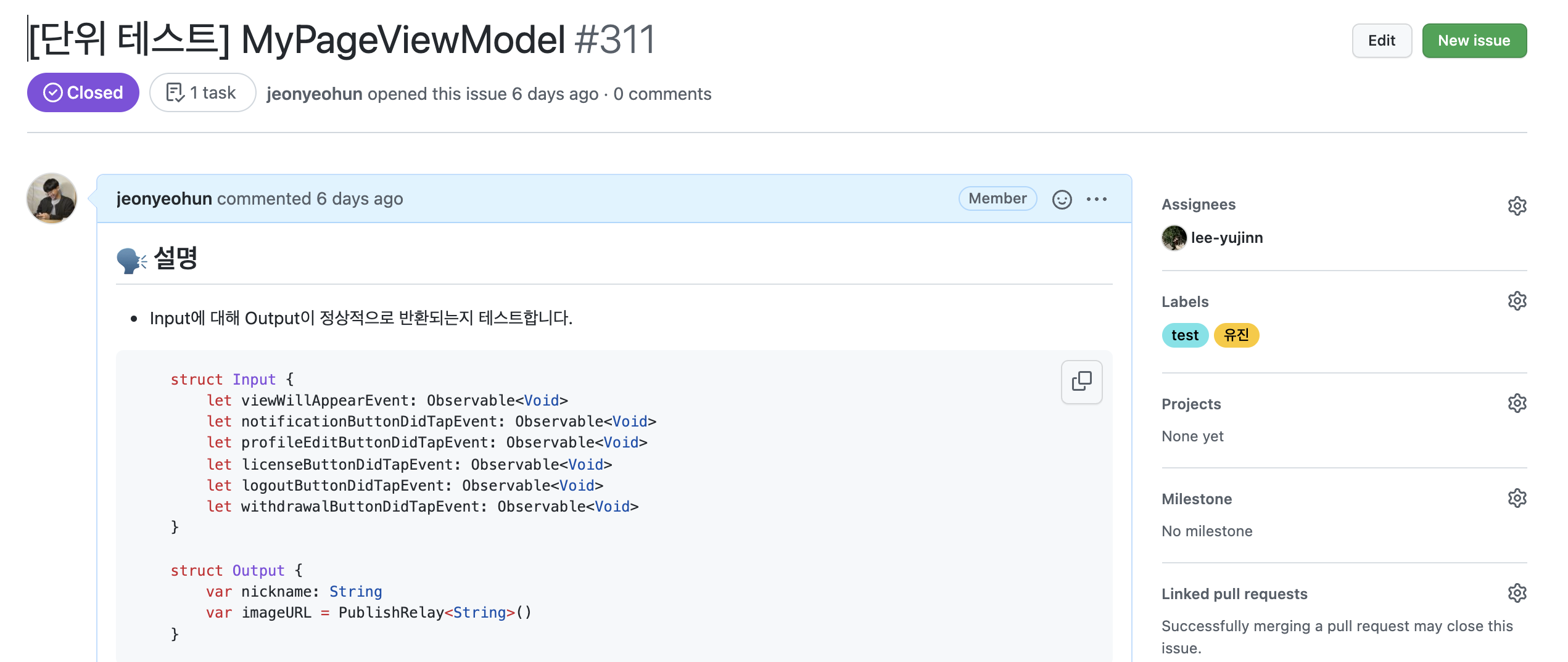 ์ ํฌ ํ์ MVVM๊ณผ ํด๋ฆฐ ์ํคํ ์ฒ๋ฅผ ํ๋ก์ ํธ์ ์ ์ฉํ๋๋ฐ์, ์ด๋ฐ ๊ตฌ์กฐ๋ก ๋๋์์ ๋ ์ป๋ ํฐ ์ด์ ์ค ํ๋๊ฐ ํ ์คํธ๊ฐ ์ฉ์ดํ ๊ตฌ์กฐ์ ๋๋ค. ํ๋ก์ ํธ ๋ง๋ฌด๋ฆฌ๊น์ง ๋ฑ ํ ์ฃผ, ์ ํฌ ํ์ ๋จ์ ํ ์ฃผ์ ๋ชฉํ๋ฅผ ์ฐ๋ฆฌ๊ฐ ๋๋ ๋ทฐ ๋ชจ๋ธ๊ณผ ์ ์ฆ ์ผ์ด์ค๋ฅผ ์๋ฒฝํ๊ฒ ๋จ์ ํ ์คํธํด๋ณด๋ ๊ฒ์ผ๋ก ์ก์์ต๋๋ค.