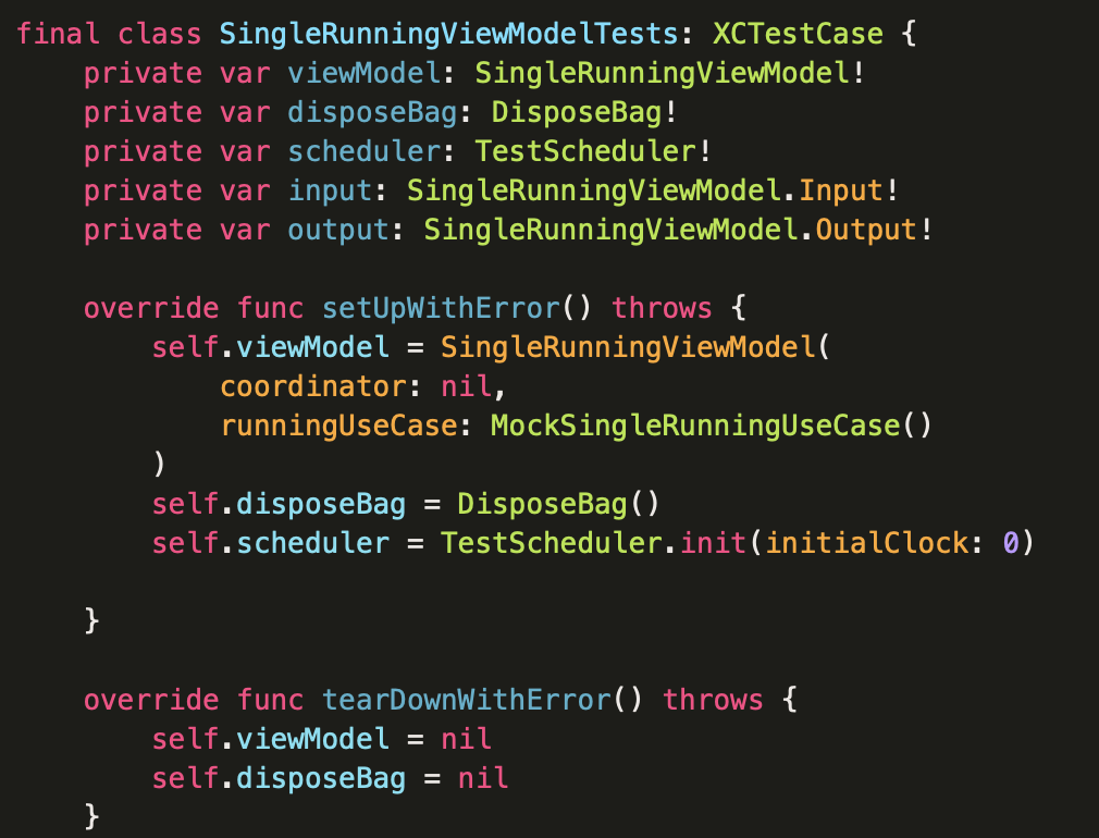 RxTest๋ก ํ ์คํธ๋ฅผ ์งํํ ๋๋ TestScheduler ๊ฐ์ฒด๋ฅผ ์ ๊ทน์ ์ผ๋ก ํ์ฉํ์ต๋๋ค. ์๋๋ ๋ฌ๋ฆฌ๊ธฐ ์ด๋ ์ค ํ๋ฉด์ ๋ทฐ ๋ชจ๋ธ์ ๋ํ ํ ์คํธ์ ๋๋ค. ์ด ํ ์คํธ๋ฅผ ๊ธฐ์ค์ผ๋ก ์ด๋ป๊ฒ RxTest๋ก ๋จ์ ํ ์คํธ๋ฅผ ์งํํ๋์ง ์ด์ผ๊ธฐํด๋ณด๊ฒ ์ต๋๋ค!