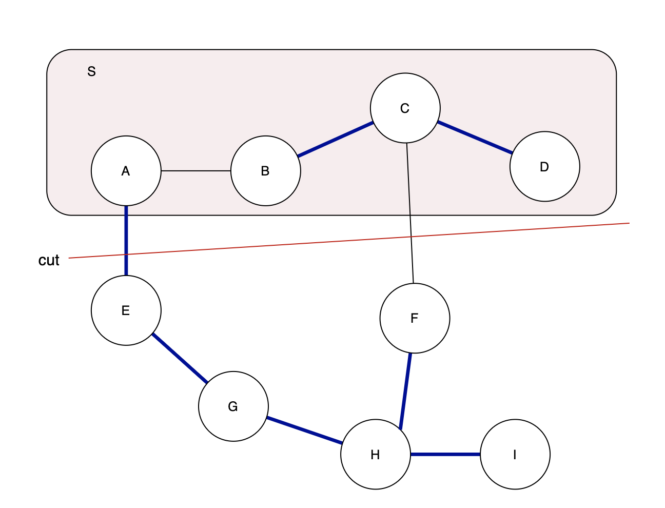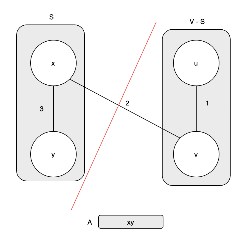 - MST์ ๋ถ๋ถ์งํฉ์ธ A์๋ ๊ฐ์ xy๊ฐ ์ ์ฅ๋์ด ์๋ค. ๋ฐ๋ผ์ ํ์ฌ๊น์ง cut ์ A์ respect ํ๋ค.