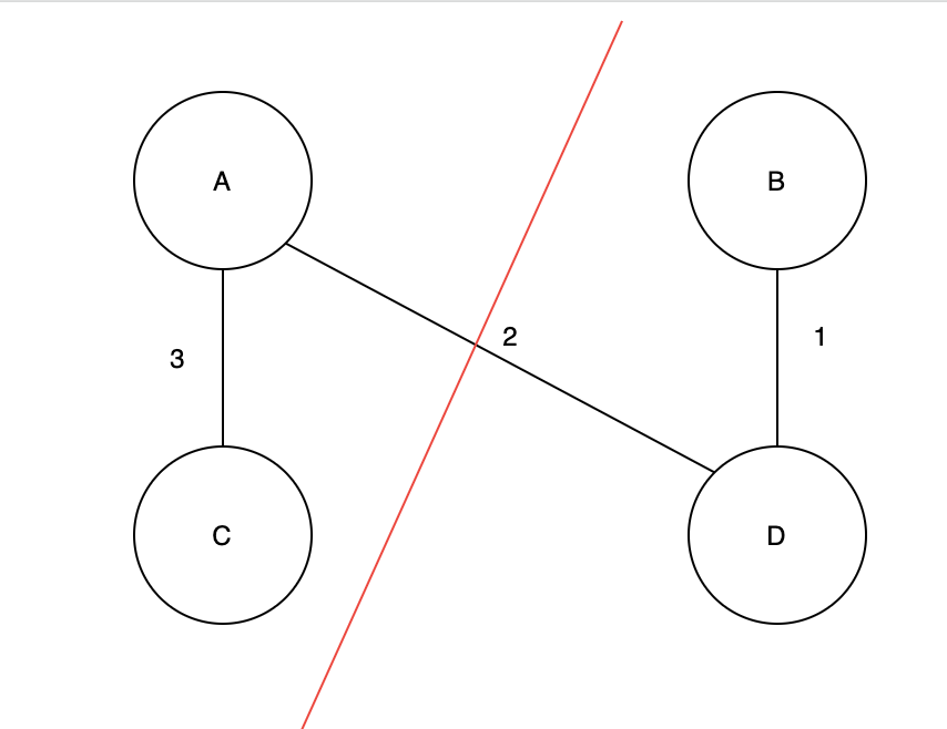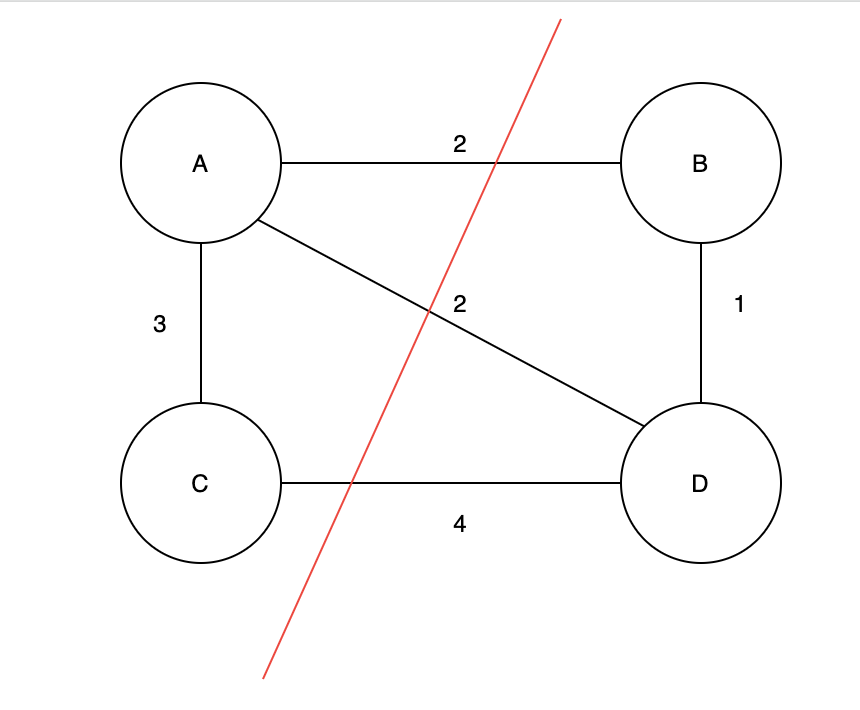 ์ ๊ทธ๋ฆผ์ฒ๋ผ ๊ทธ๋ํ๋ฅผ ์ด๋ฃจ๋ ์ ์ ์ ์งํฉ {A, B, C, D} ๋ฅผ {A, C}, {B, D} ๋ก ๋๋ ์ ์๋ค. ๋ฐ๋์ ๋ ์งํฉ์ ์ ์ ์ ์๊ฐ ๊ฐ๊ฒ ๋๋์ด์ ธ์ผํ๋ ๊ฒ์ ์๋๊ณ ์ ์ฒด ์งํฉ์์ ๋ ์งํฉ์ผ๋ก ๋๋์ด์ง๊ธฐ๋ง ํ๋ฉด ๋๋ค.
